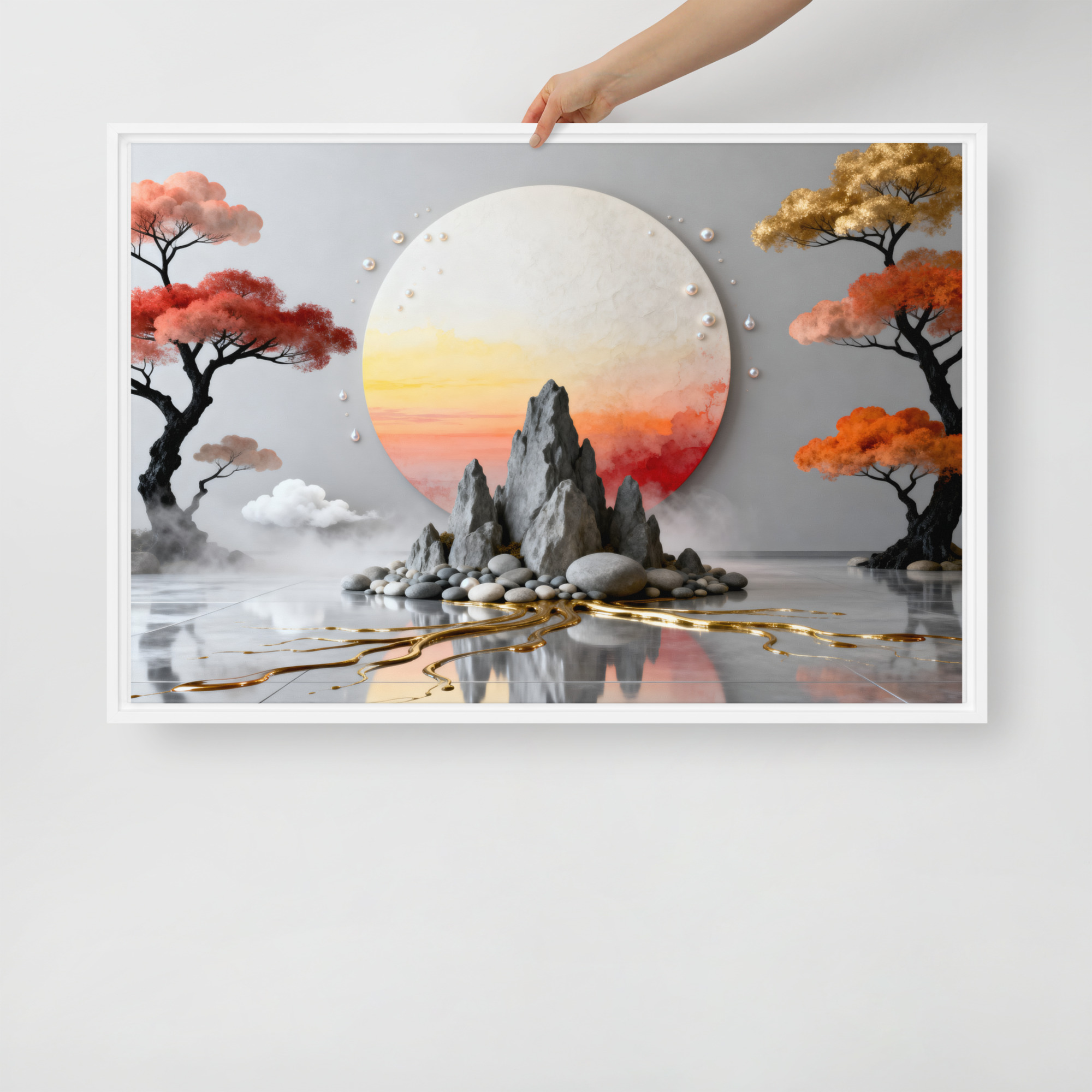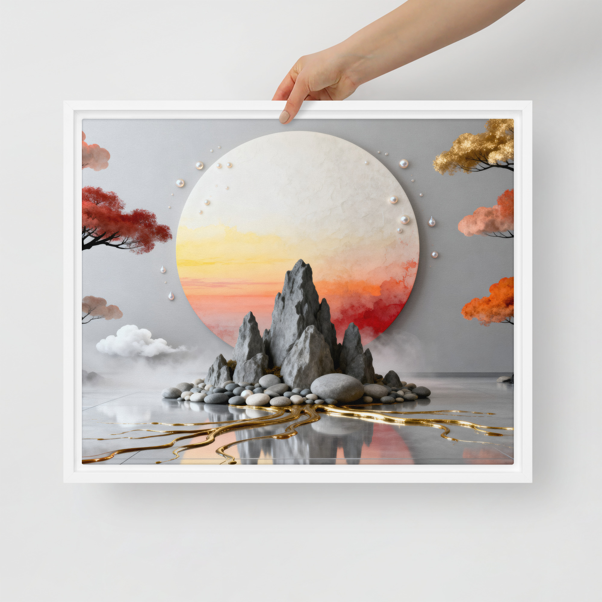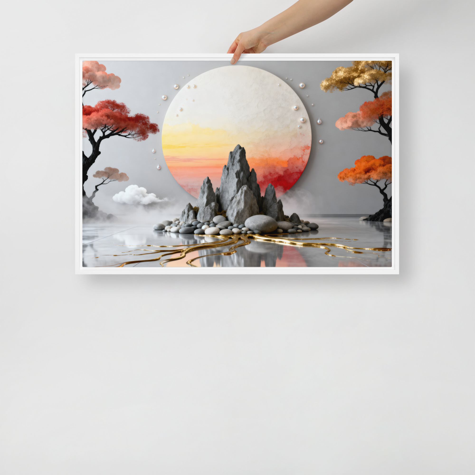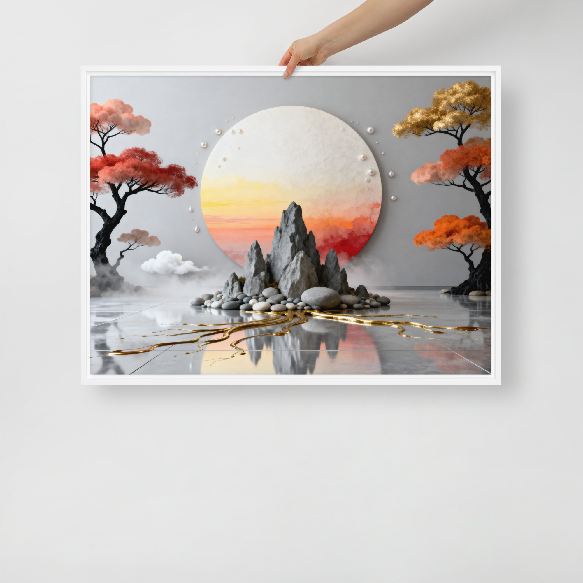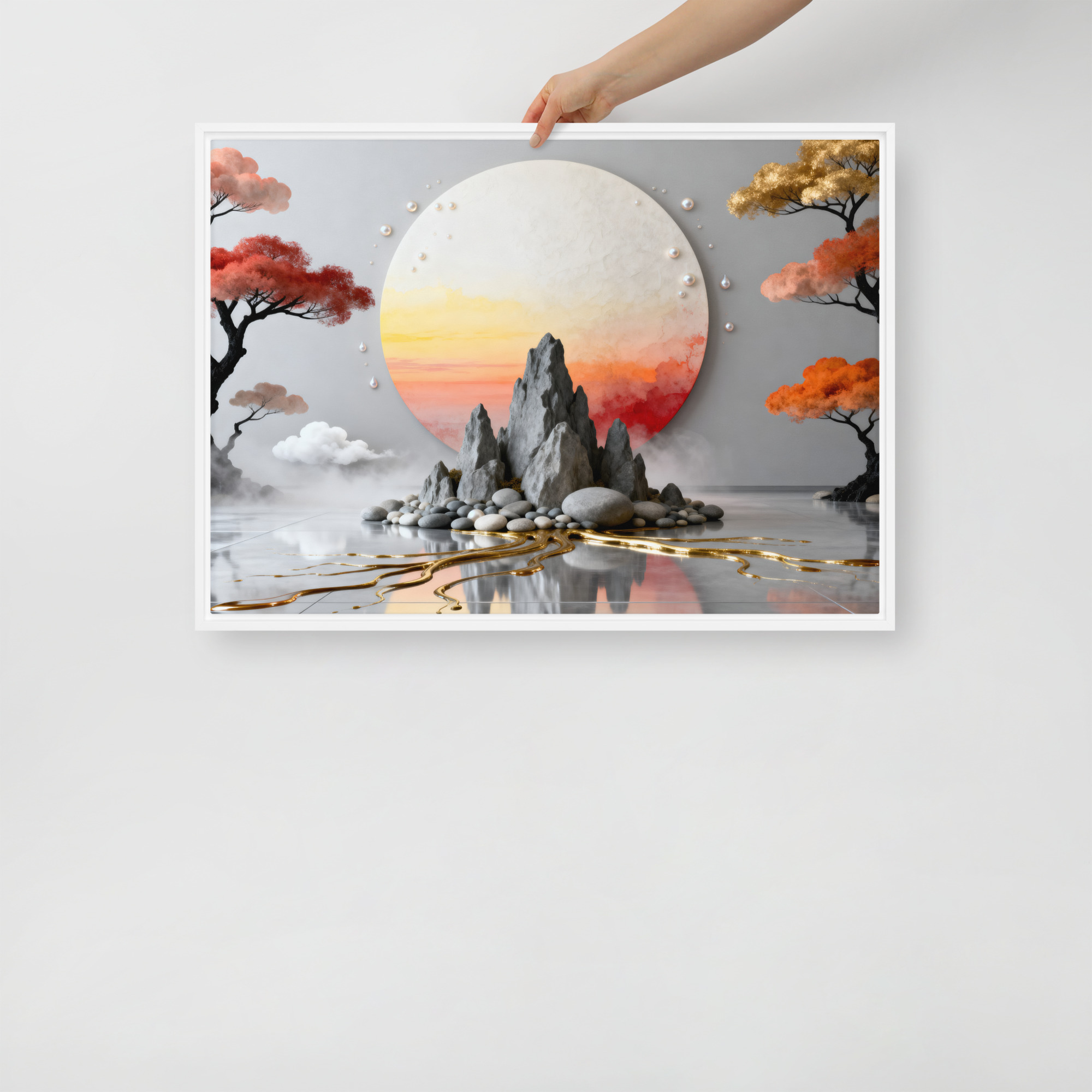 A serene fusion of nature and modern minimalism, Ethereal Horizon captures a tranquil mountain formation framed by a glowing sunset disc. Accents of flowing gold and soft mist create a sense of depth and calm, while vibrant autumn trees add a subtle contrast. Perfect for elevating contemporary interiors with a peaceful yet luxurious artistic statement.