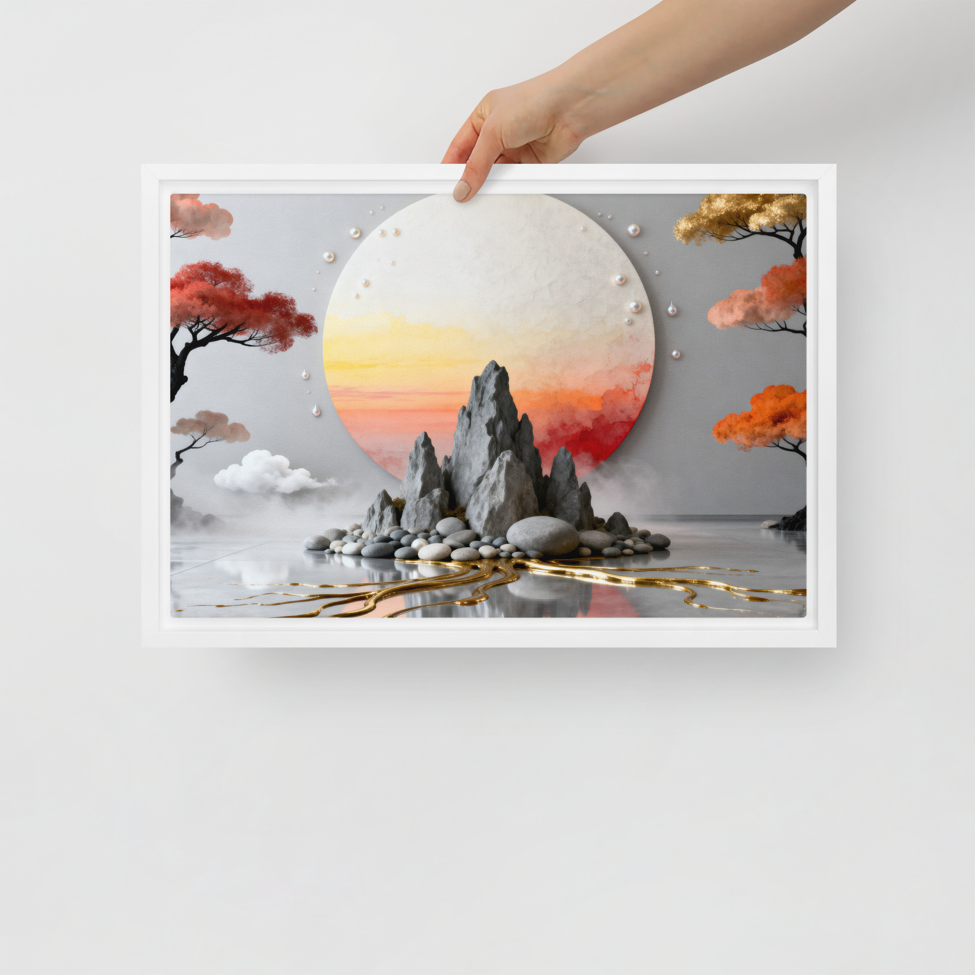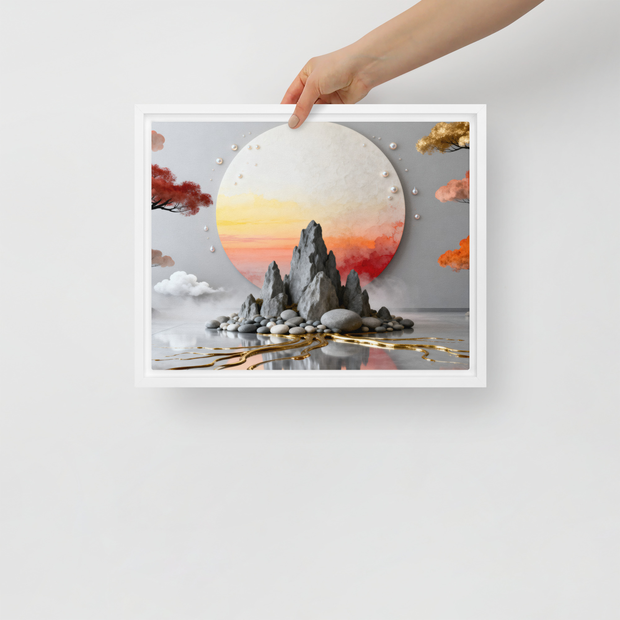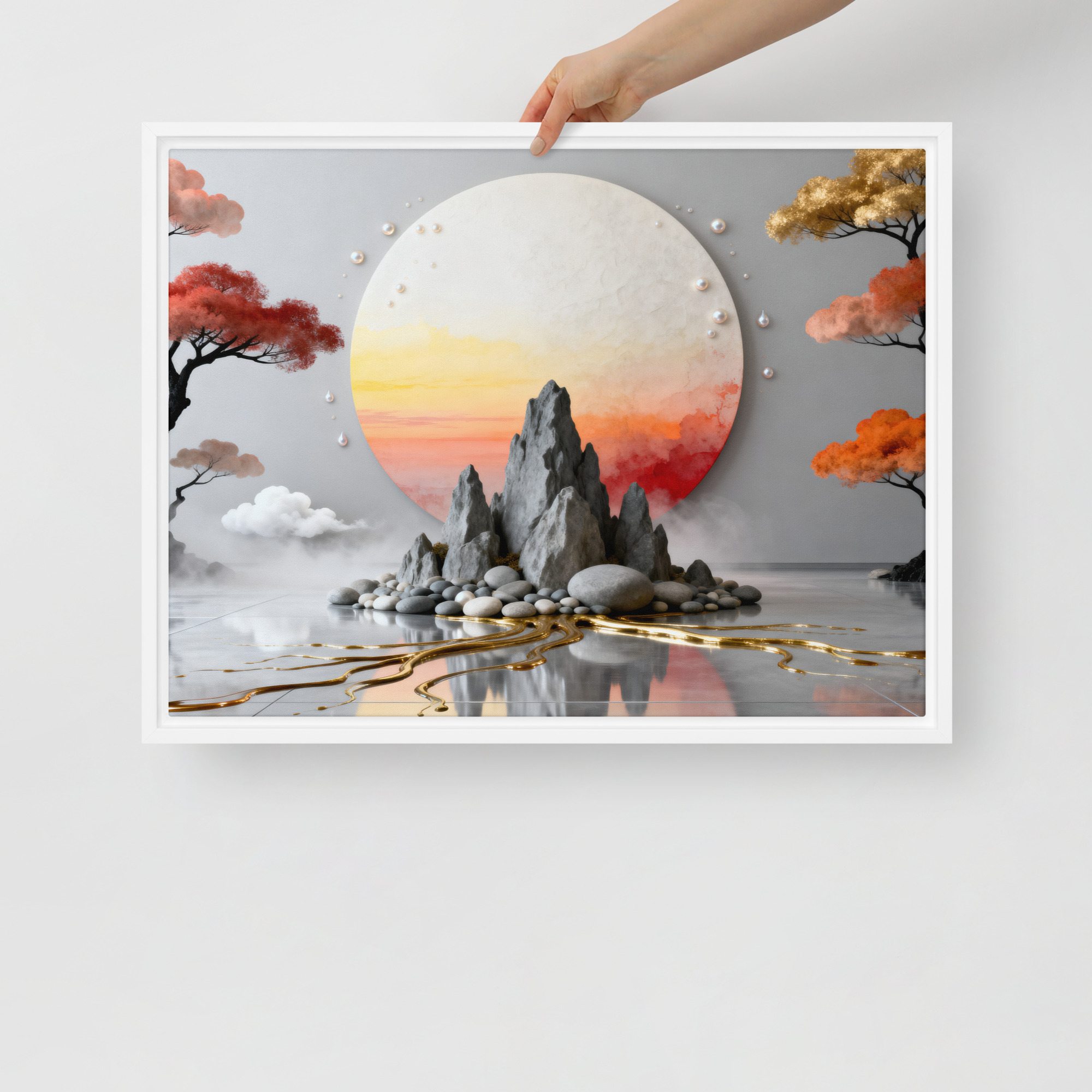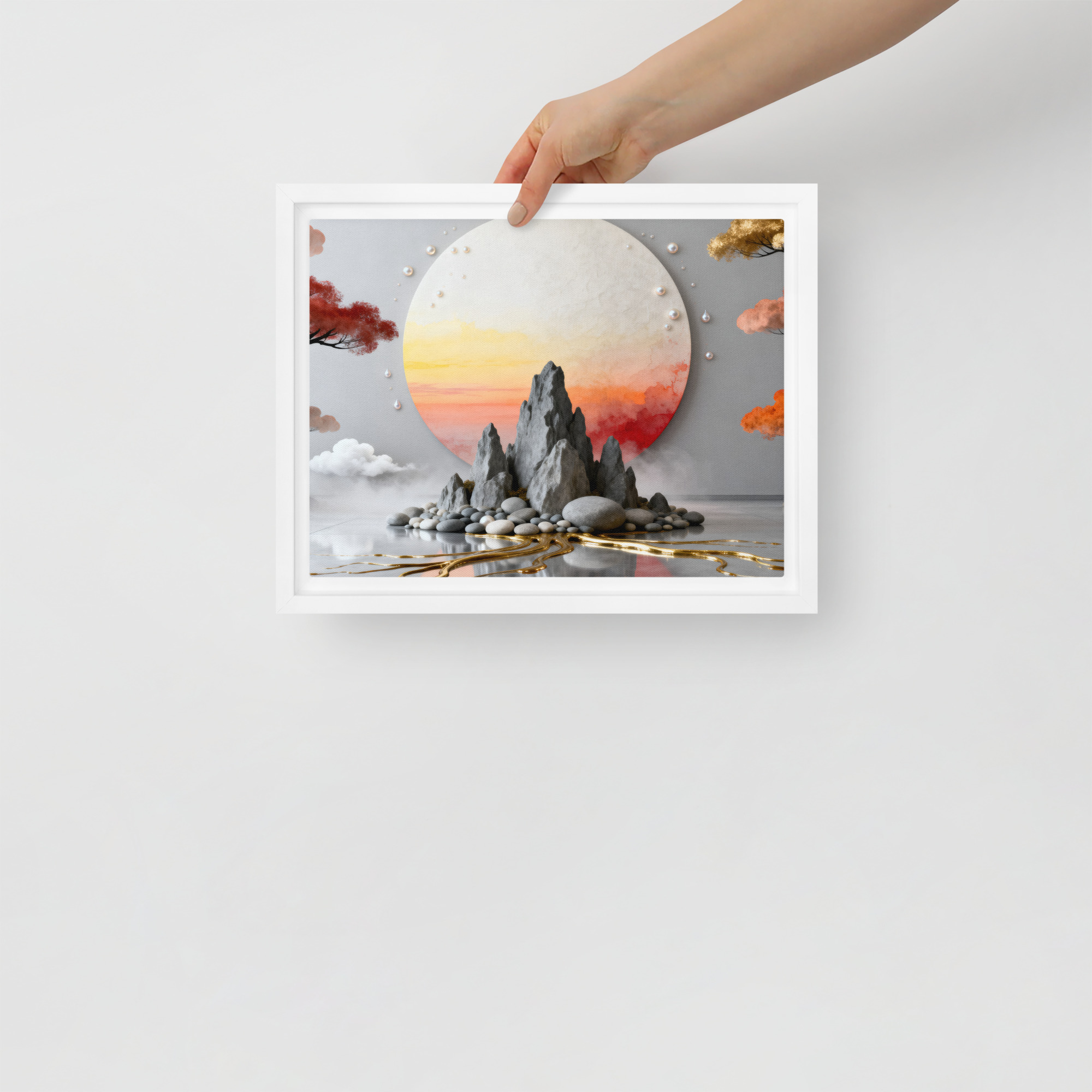 A serene fusion of nature and modern minimalism, Ethereal Horizon captures a tranquil mountain formation framed by a glowing sunset disc. Accents of flowing gold and soft mist create a sense of depth and calm, while vibrant autumn trees add a subtle contrast. Perfect for elevating contemporary interiors with a peaceful yet luxurious artistic statement.