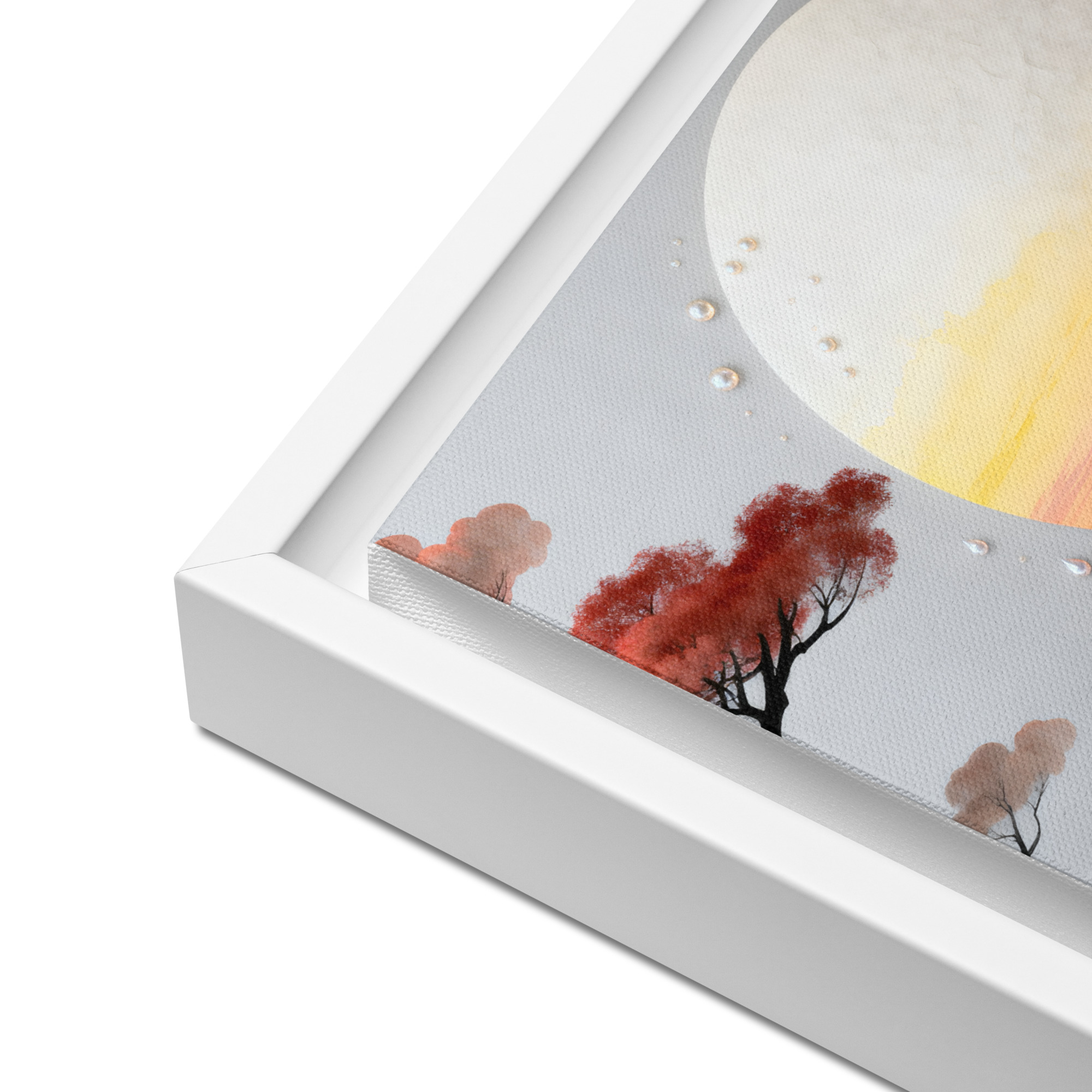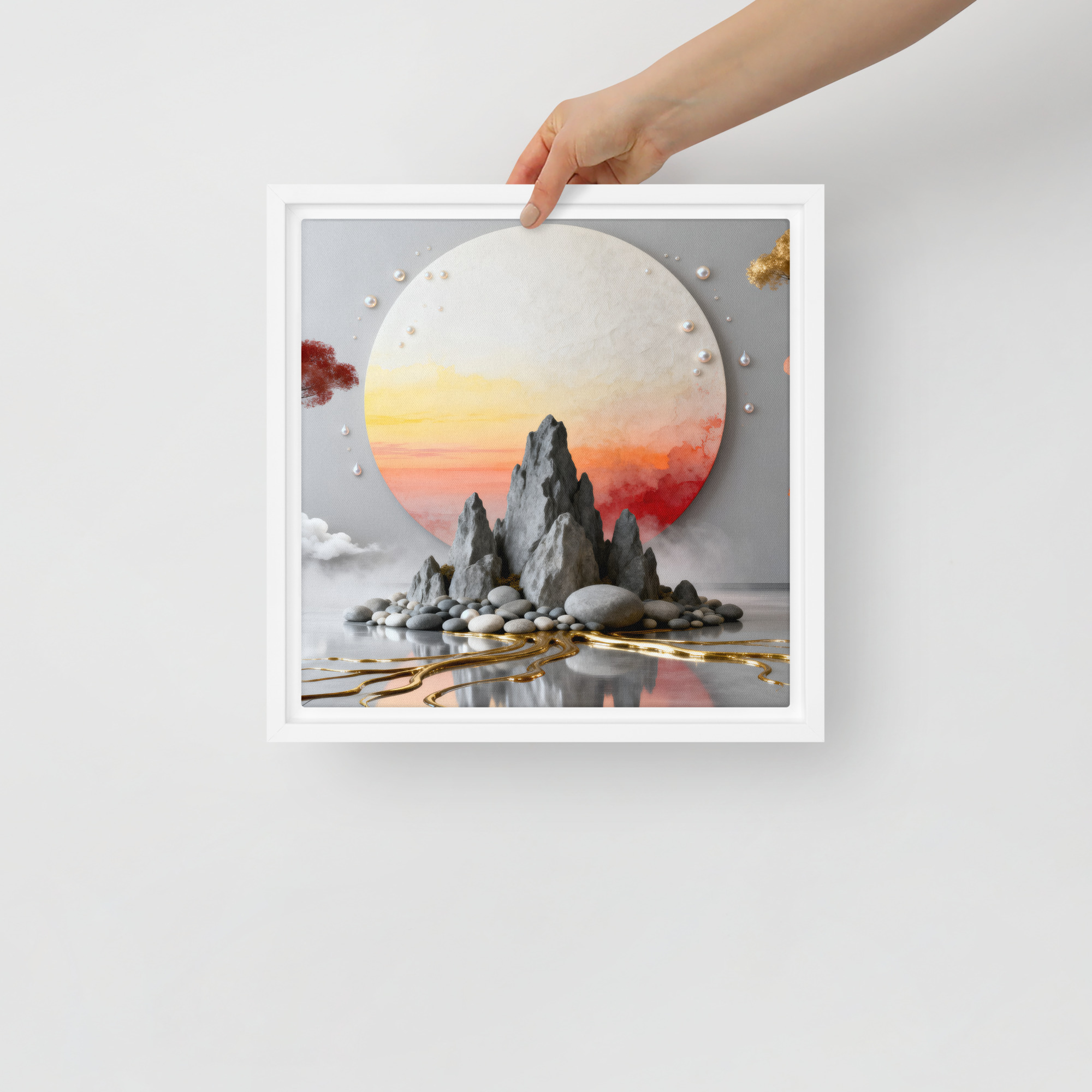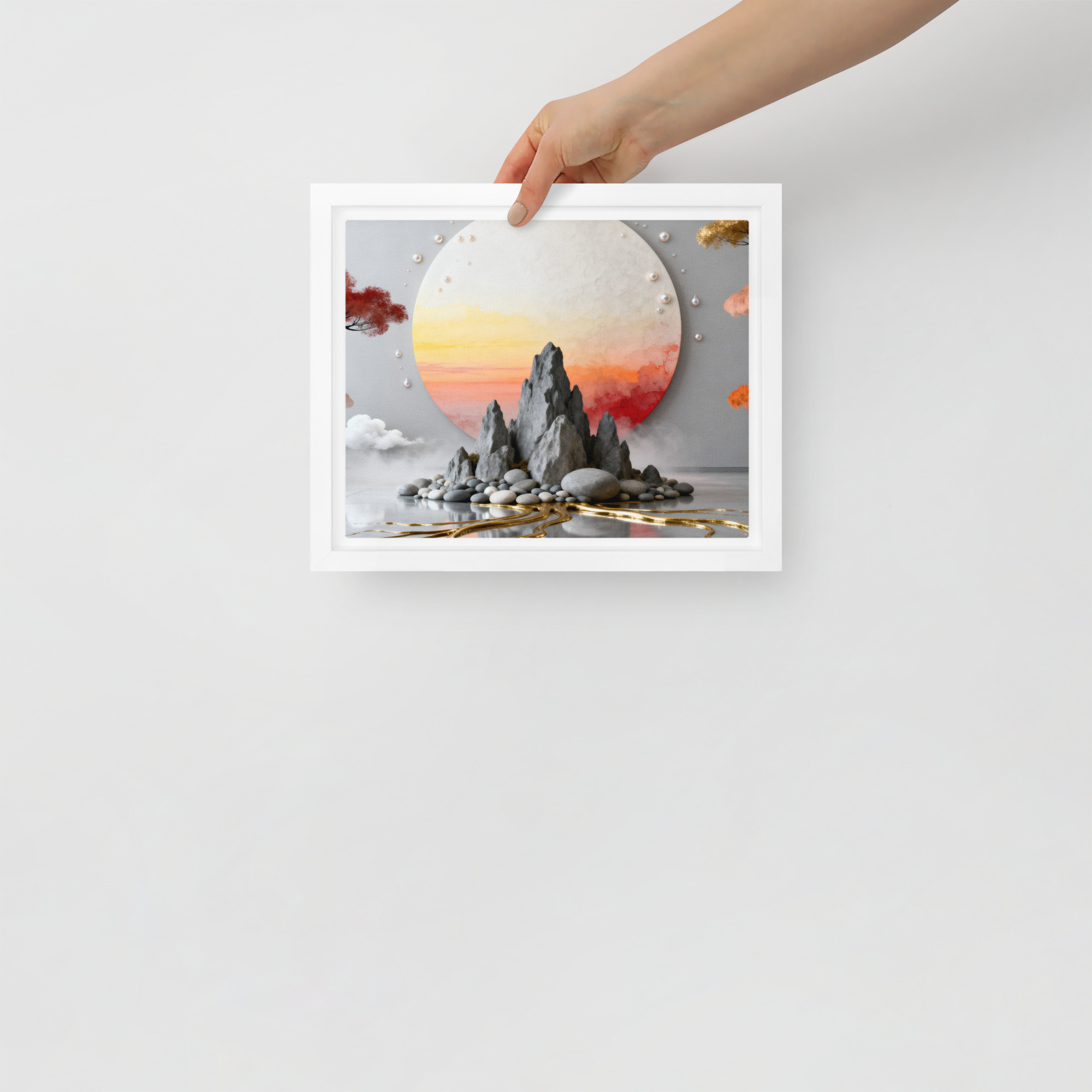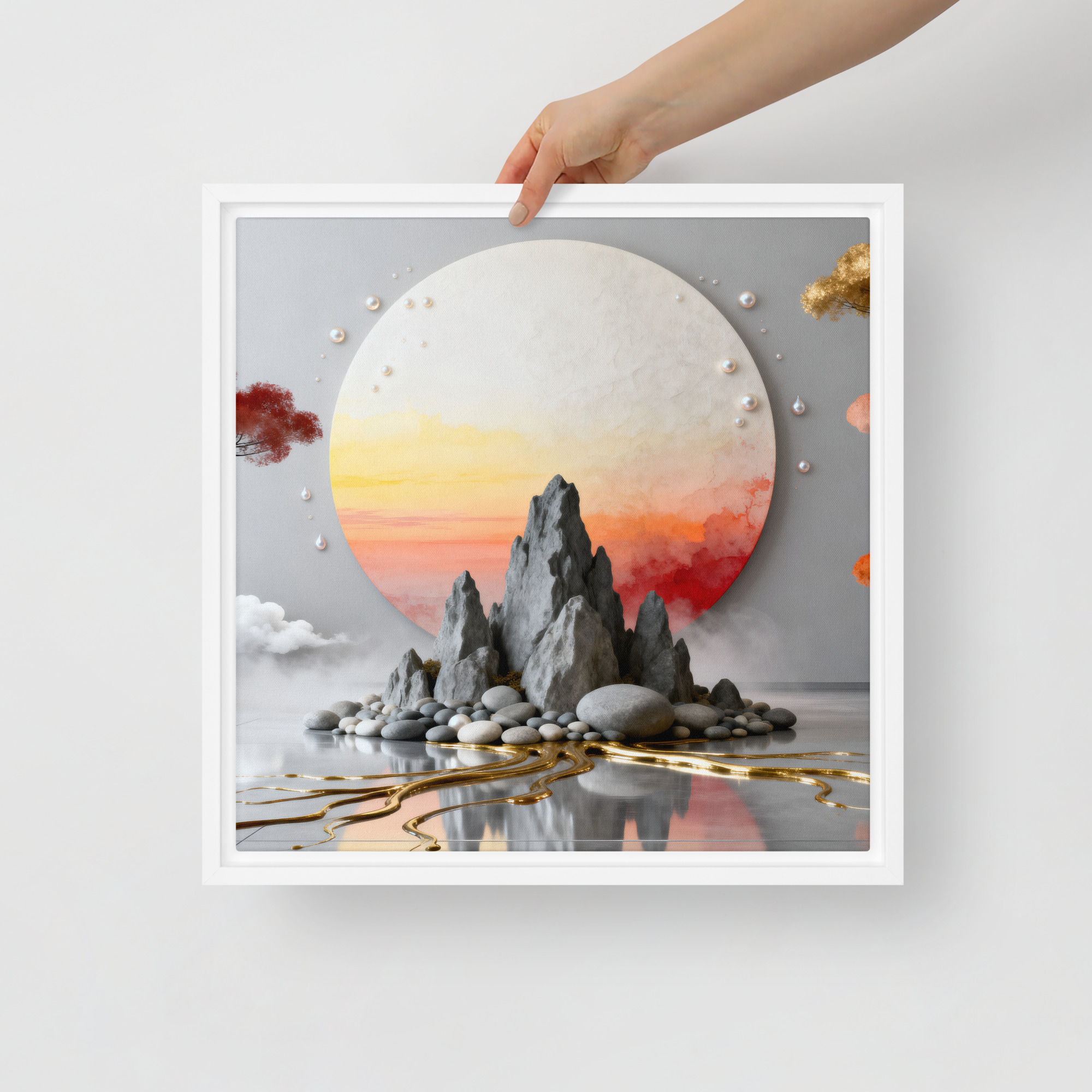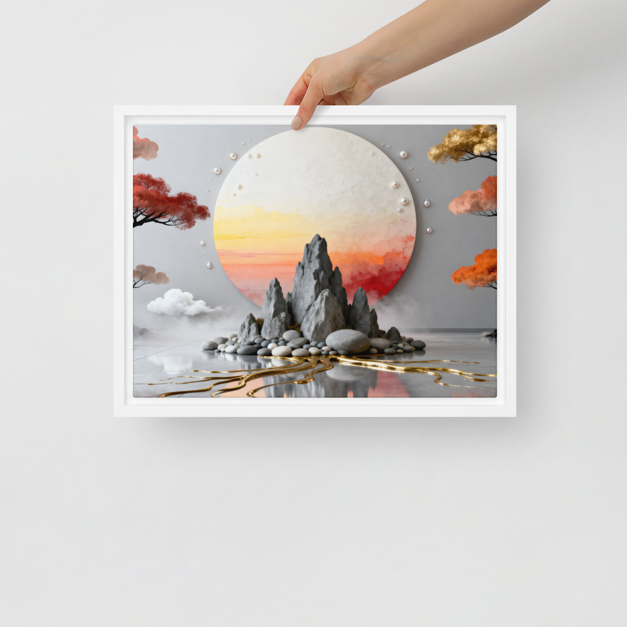 A serene fusion of nature and modern minimalism, Ethereal Horizon captures a tranquil mountain formation framed by a glowing sunset disc. Accents of flowing gold and soft mist create a sense of depth and calm, while vibrant autumn trees add a subtle contrast. Perfect for elevating contemporary interiors with a peaceful yet luxurious artistic statement.