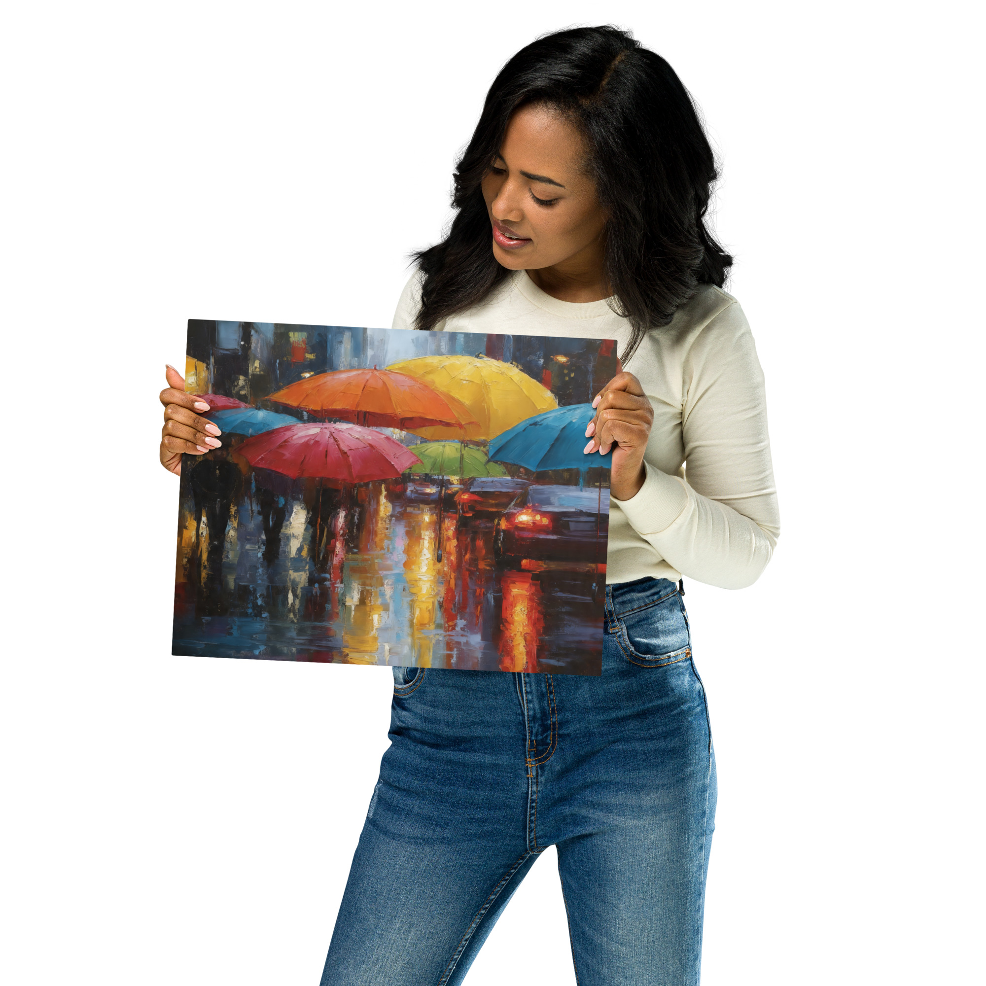 A vibrant cascade of colorful umbrellas floating through a rainy cityscape, blending soft reflections with bold brush strokes. The artwork captures the rhythm of rain and the warmth of color against a moody urban backdrop.